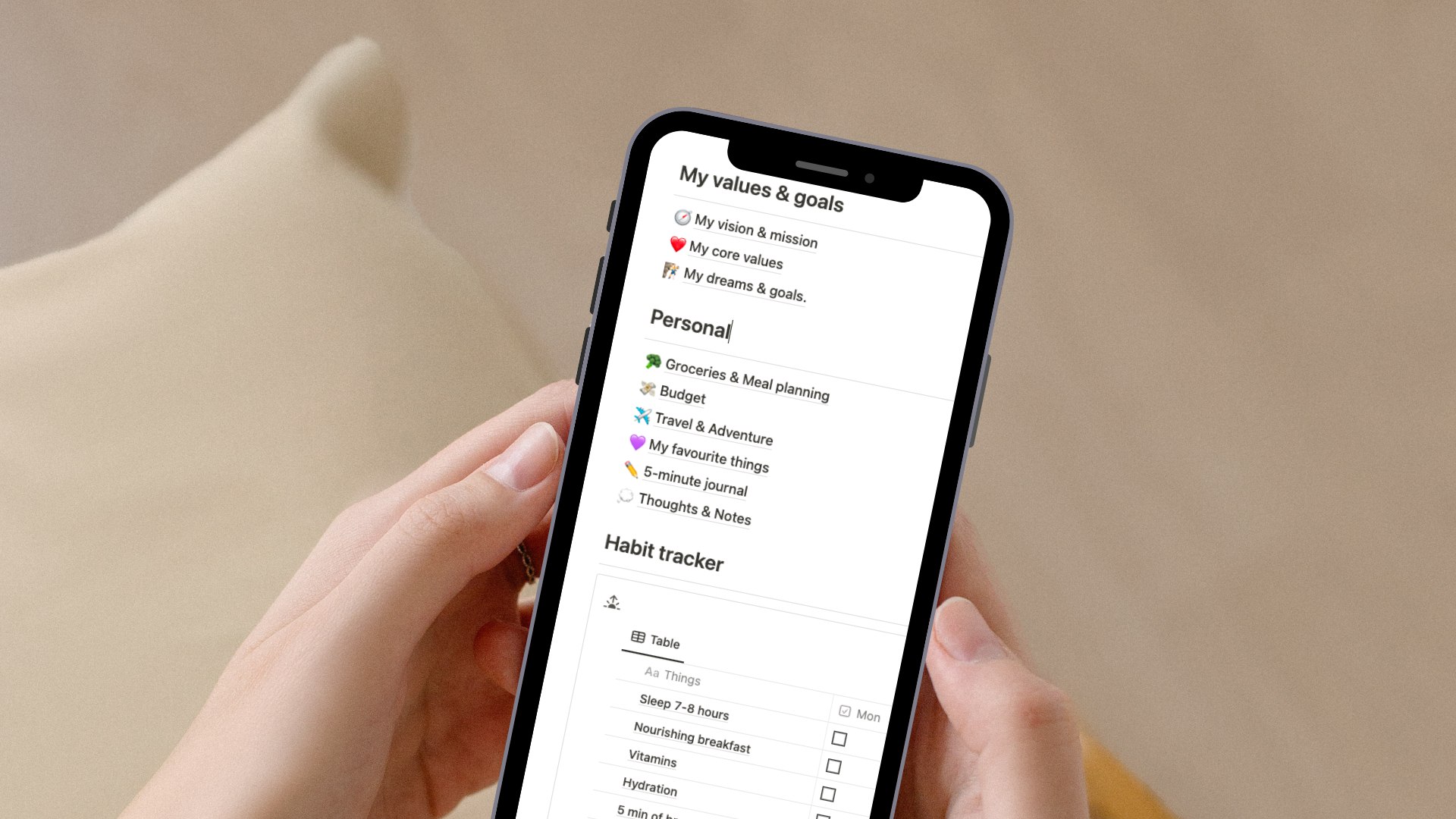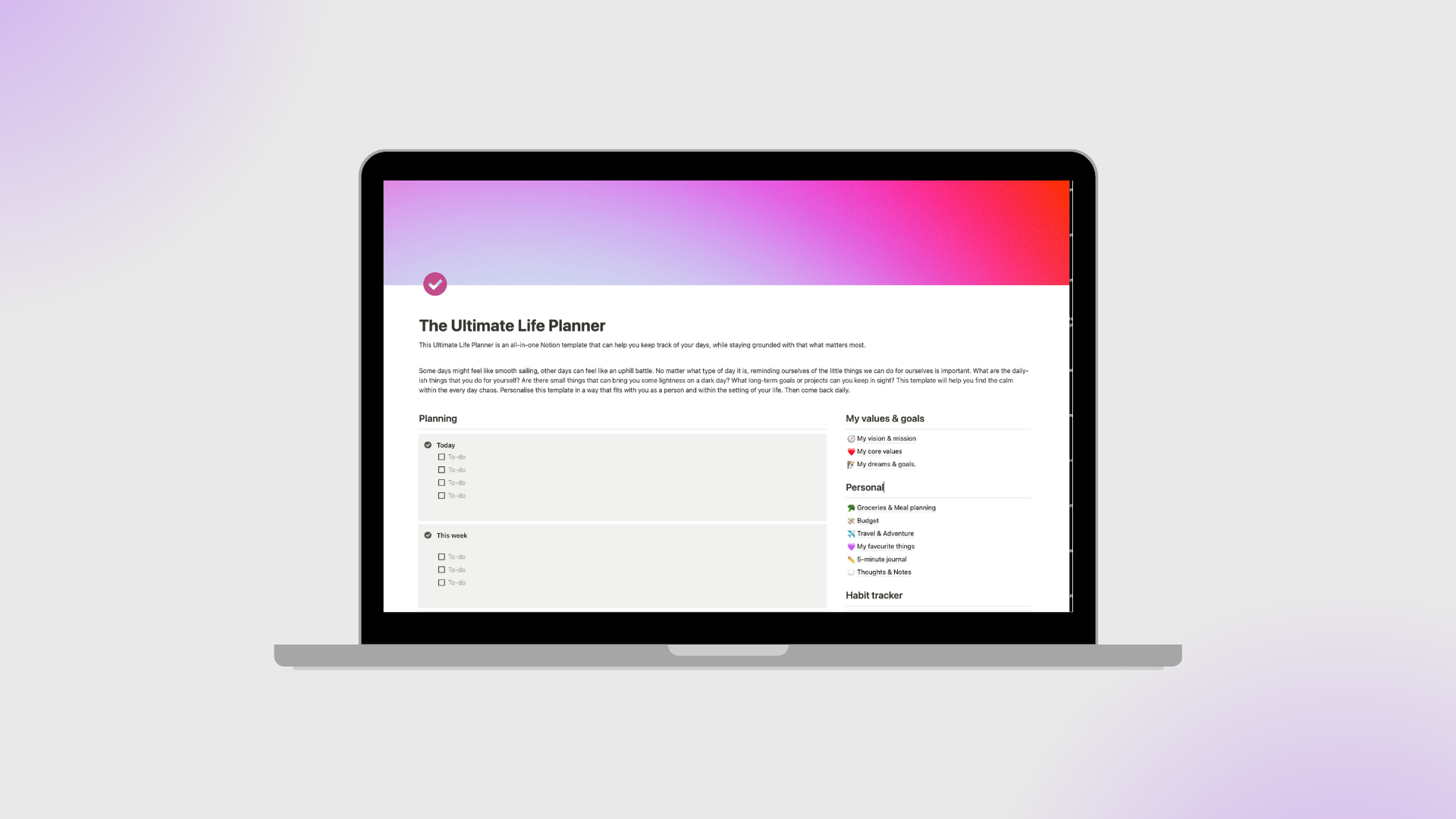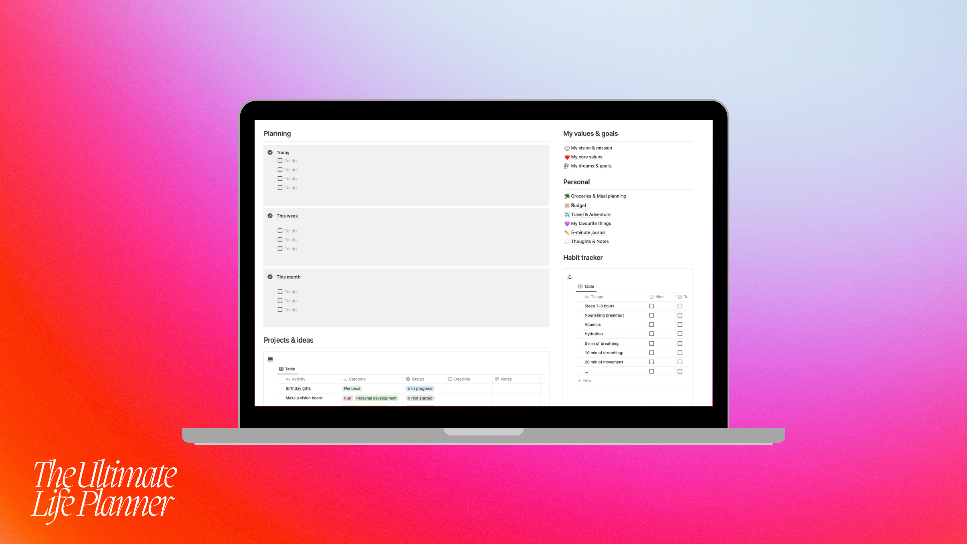 This Ultimate Life Planner is an all-in-one Notion template that can help you keep track of your days, while staying grounded with that what matters most.